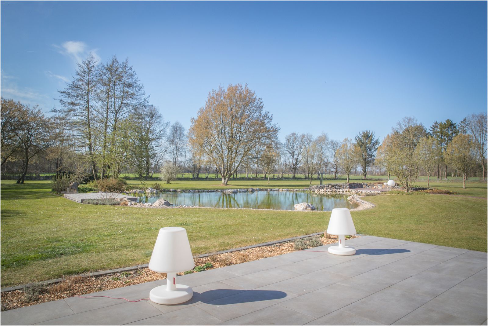 Inmitten des parkähnlichen Gartens wurde ein aufwändiger Schwimmteich errichtet, der im Jahr 2024 umgestaltet wurde. Hier bieten sich im Sommer neben der großzügigen Terrasse am Haupt- und Gästehaus noch sehr schöne Sitzmöglichkeiten zum Entspannen.