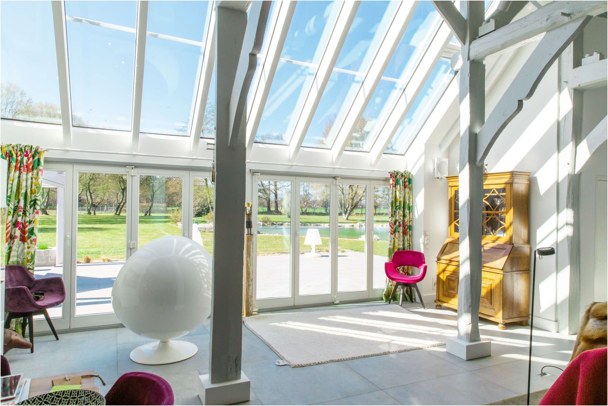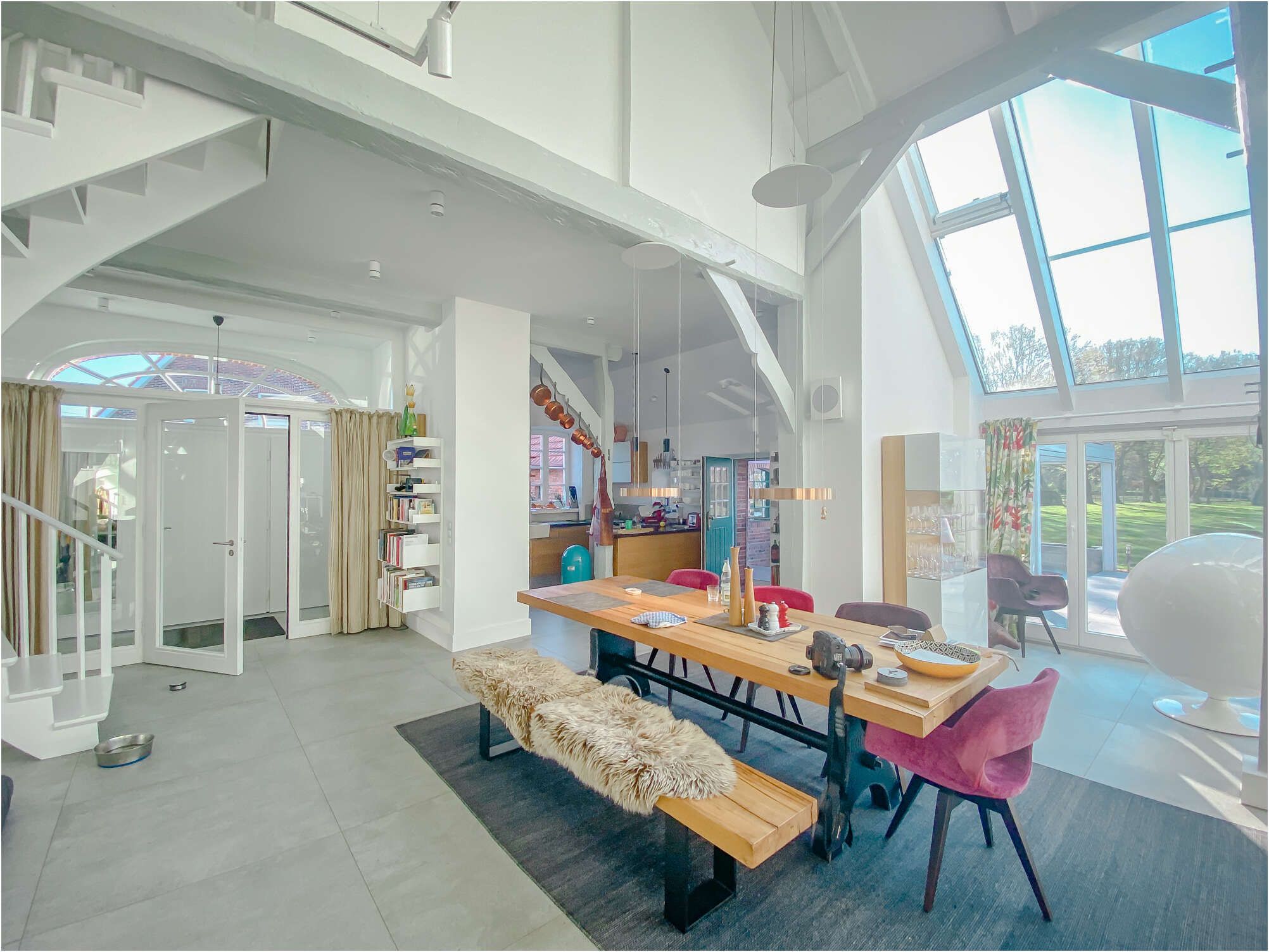 Das Haupthaus wurde stilvoll eingerichtet. Vom Eingangsbereich / Windfang gelangen Sie in den großzügigen, mit sehr viel Licht durchfluteten Wohn- und Essbereich. Hier wurde zentral für die kalte Jahreszeit der historische Kamin erhalten und modernisiert. Vom Wohn- und Essbereich haben Sie, durch die großzügigen Fensterelemente, einen wunderschönen Blick auf den Garten.